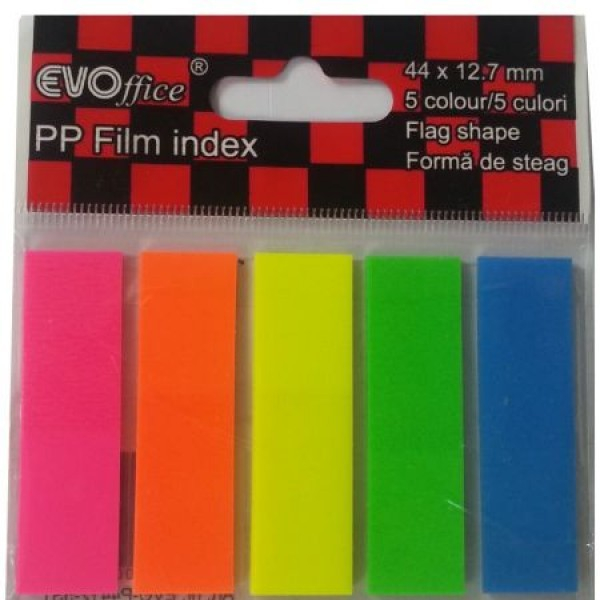 Marca: EVOffice Compoziţie: plastic Dimensiuni: 50 x 12 mm 25 etichete x 5 culori neon: portocaliu, magenta, galben, verde, albastru Ambalare: 125 etichete / set